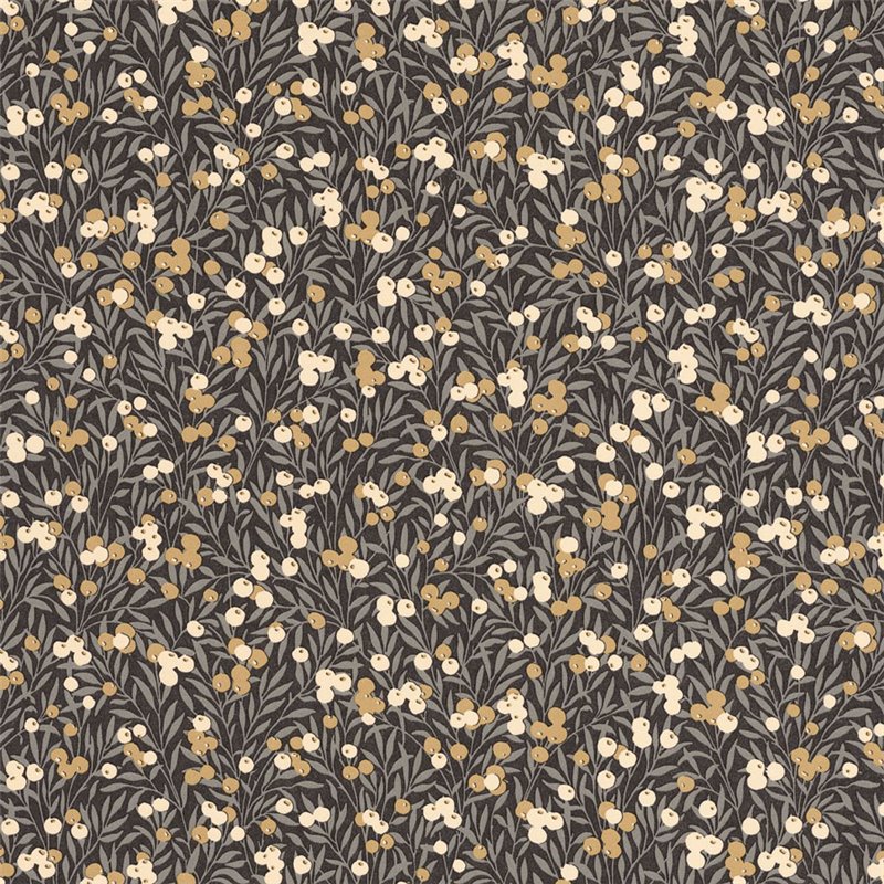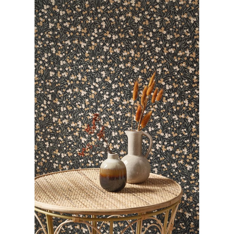 Papel pintado floral con grosellas rojas y arándanos, con un aire natural y envejecido que realza interiores sobrios.