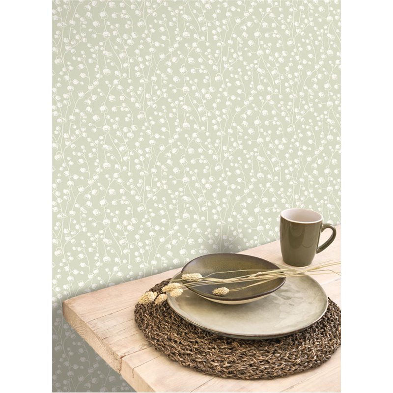 Papel pintado flores pequeñas lirios del valle beige vainilla, con efecto encalado que aporta luz y carácter a cualquier pared.