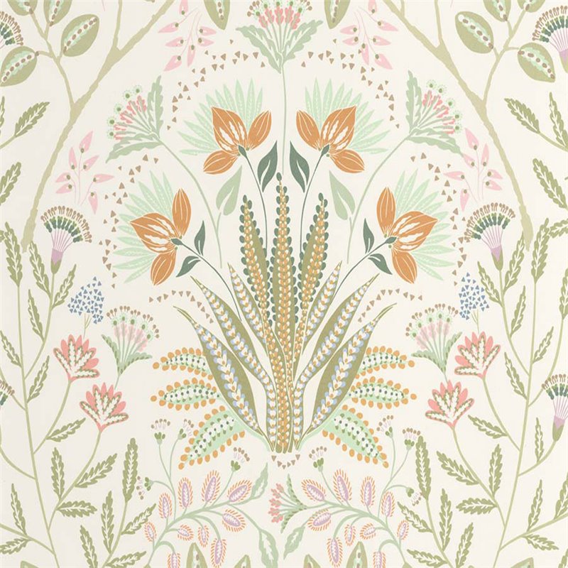 Papel pintado floral estilo inglés beige con forma de escudo heráldico, ideal para dar un aire creativo y expresivo a cualquier estancia.