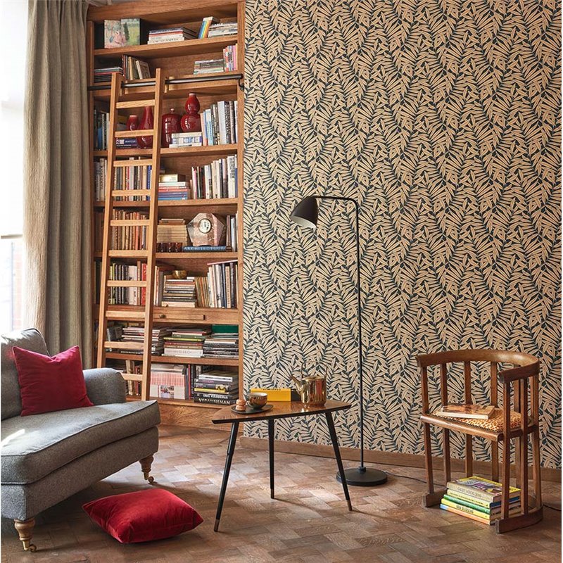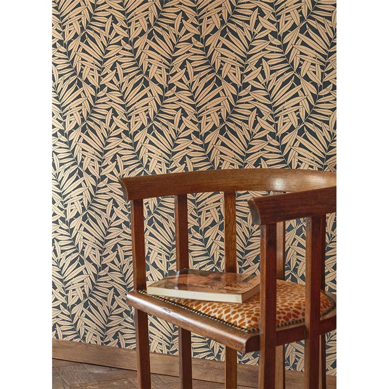 The wallpaper Casadeco Preston Mordore Noir has a botanical pattern formed by intertwined fern branches in a herringbone shape. PRESTON by Casadeco has the dynamism and depth to give your walls the realism of a wall covering and a graphic motif.