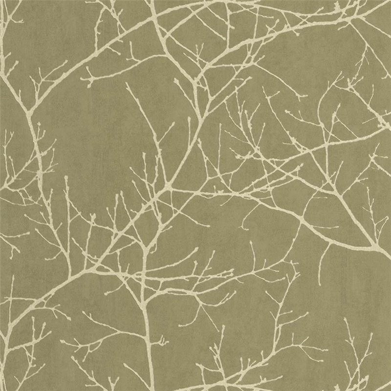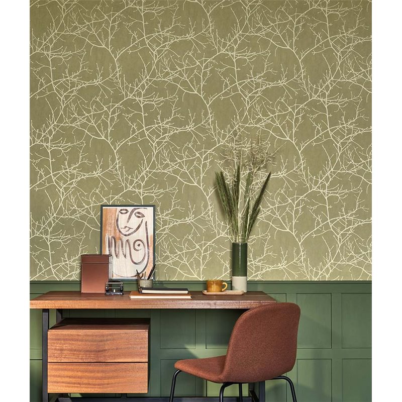 Papel pintado ramas de árboles deshojadas verde estilo nórdico, ideal para dar un aire creativo y expresivo a cualquier estancia.