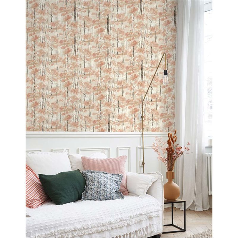 Papel pintado paisaje de bosque tonos otoñales, aportando dinamismo visual a paredes de salones, estudios o recibidores.