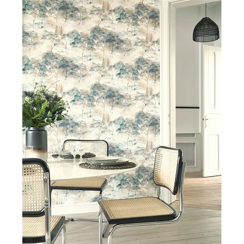 Papel pintado paisaje de bosque nocturno azul, aportando dinamismo visual a paredes de salones, estudios o recibidores.