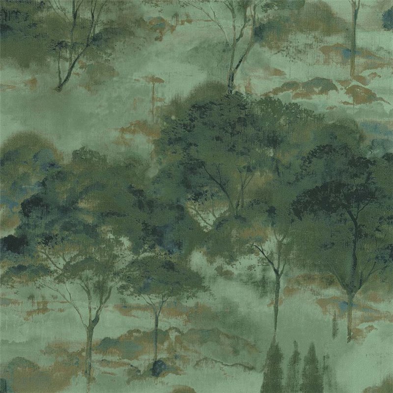 Papel pintado paisaje de bosque tonos otoñales, aportando dinamismo visual a paredes de salones, estudios o recibidores.