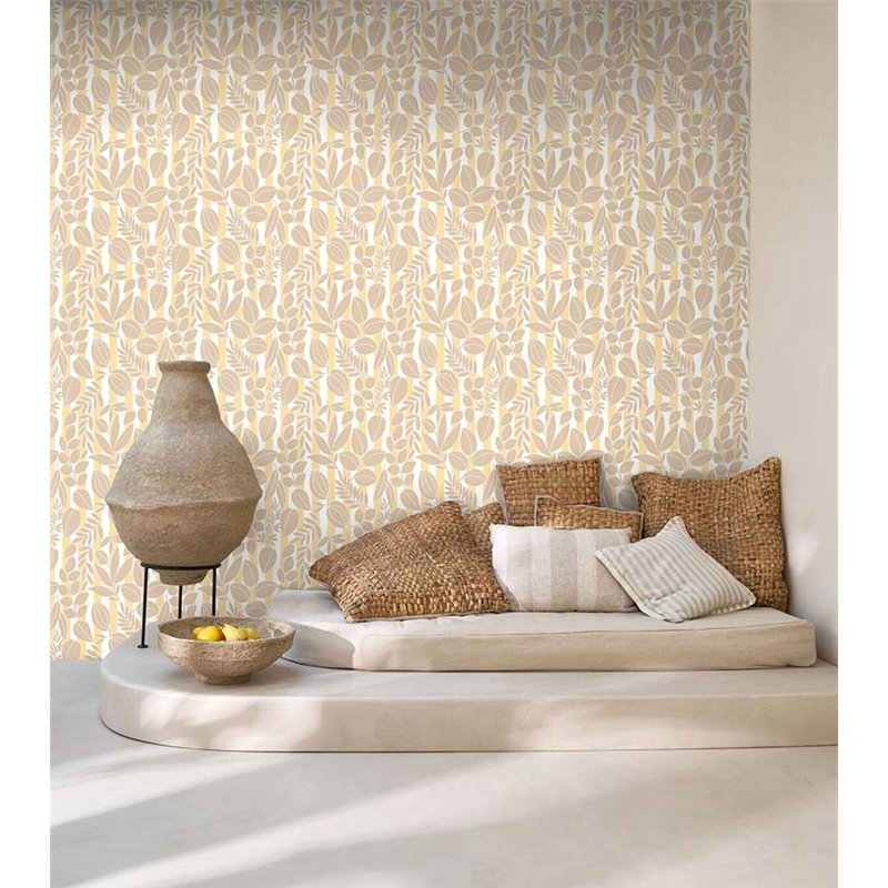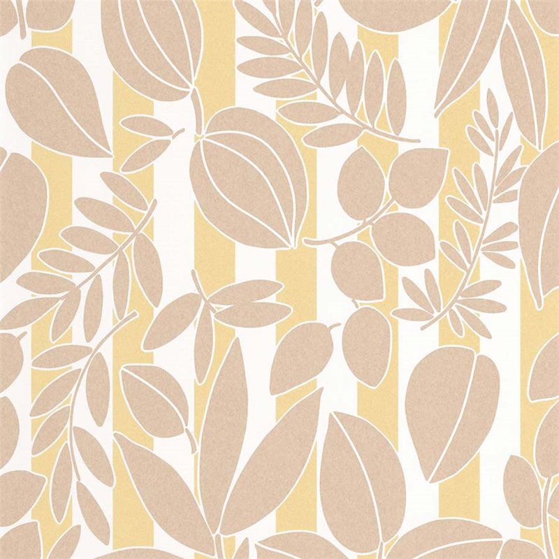 Papel pintado flores amarillas con rayas verdes de la rivera francesa, perfecto para espacios que buscan personalidad sin excesos.