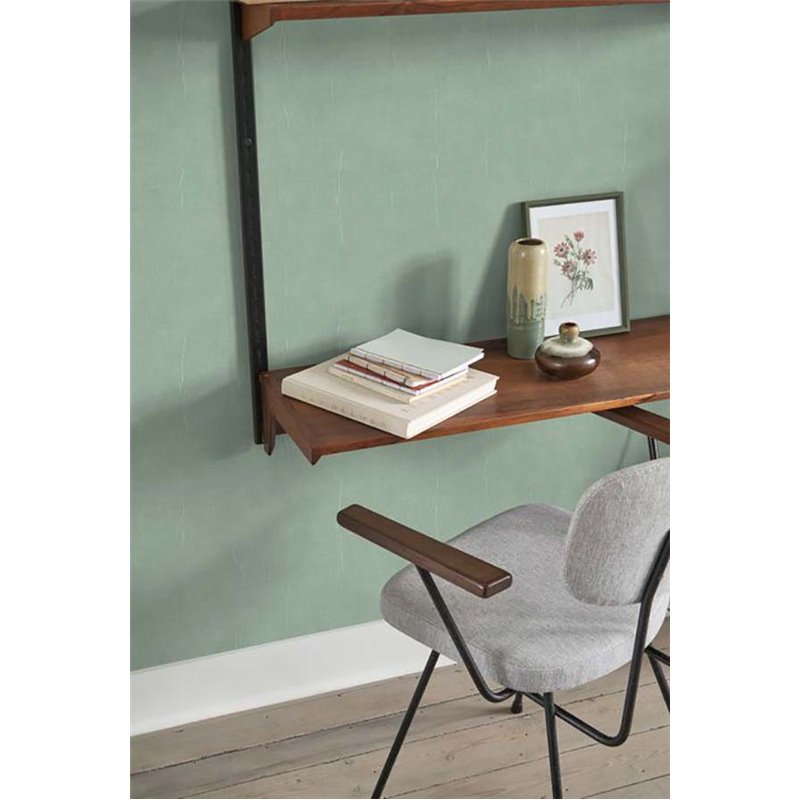 Papel pintado liso verde menta efecto muselina, una propuesta con carácter artístico para interiores contemporáneos.