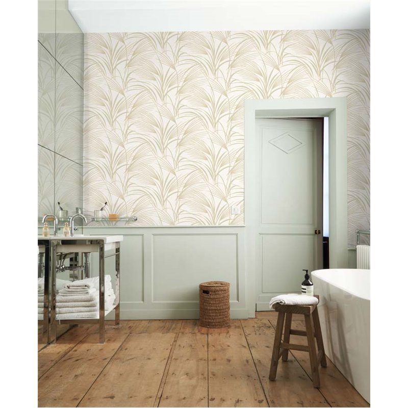 Papel pintado floral moderno con hojas de palma negro y beige, ideal para dar un aire creativo y expresivo a cualquier estancia.