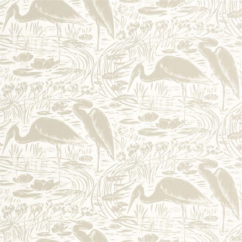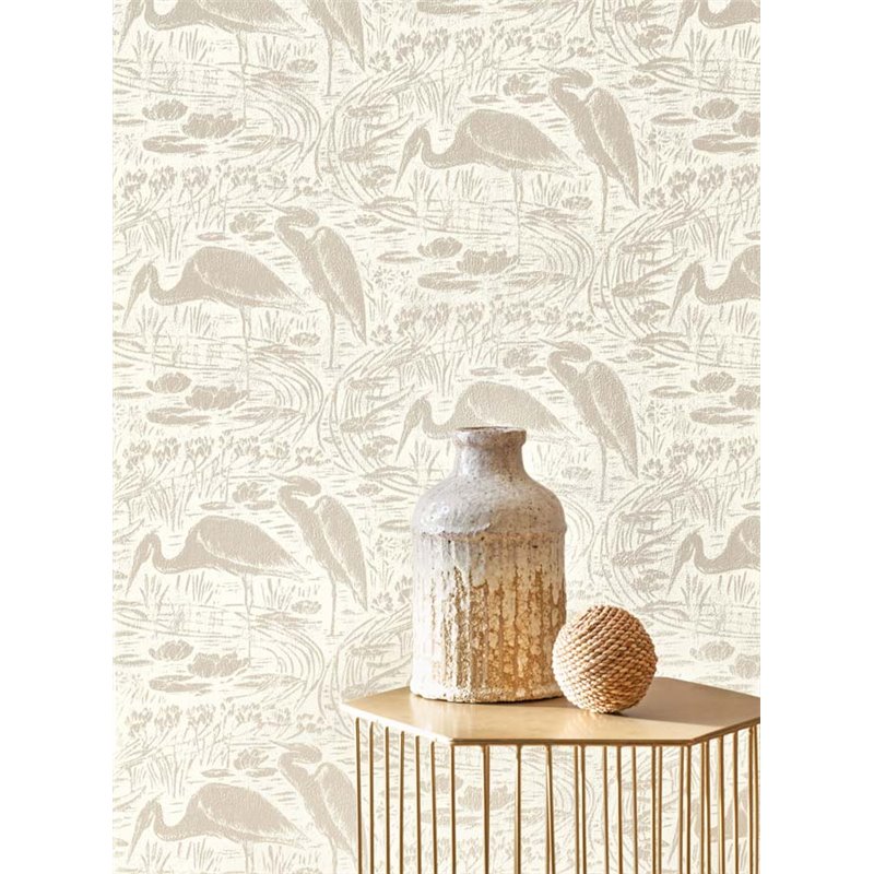 Papel pintado con garzas en la laguna beige, perfecto para espacios que buscan personalidad sin excesos.