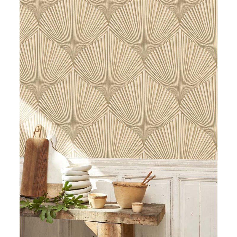 Papel pintado moderno beige con hojas de palmito o forma abanicos, perfecto para espacios que buscan personalidad sin excesos.