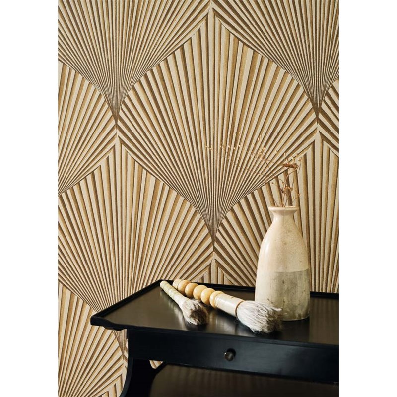 Papel pintado moderno beige con hojas de palmito o forma abanicos, perfecto para espacios que buscan personalidad sin excesos.