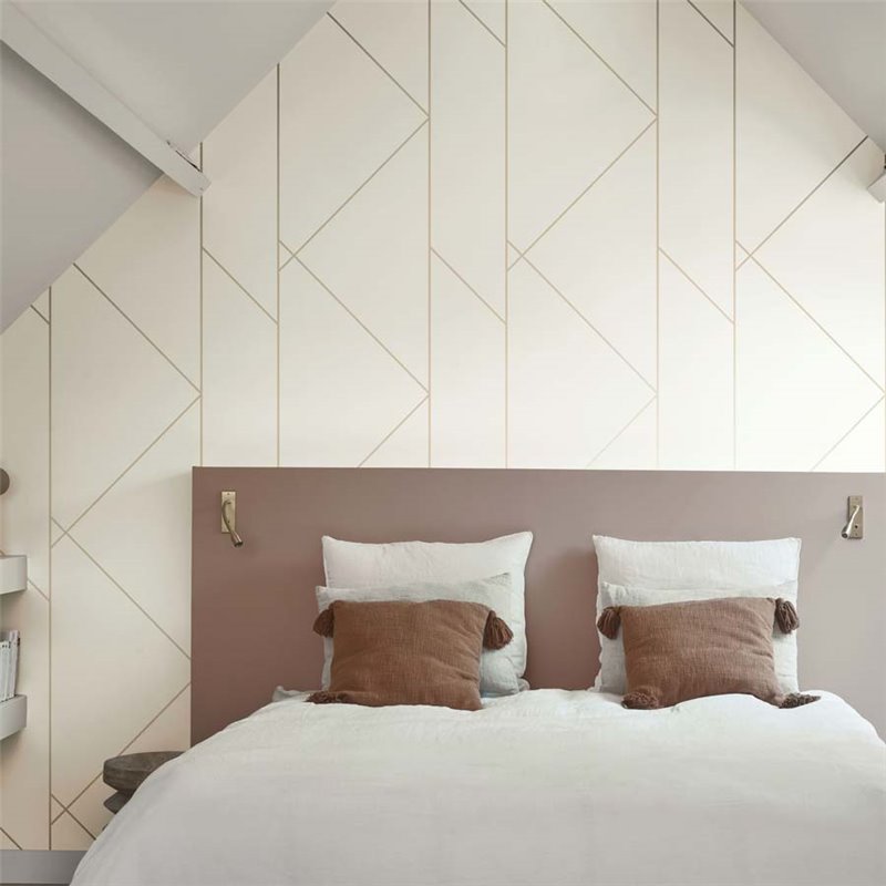 Papel pintado moderno beige y dorado con formas geométricas, una elección moderna que combina arte y diseño con sutileza.