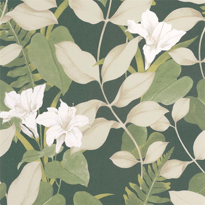 Papel pintado lirios asiáticos iridiscentes blanco y verde, estilo oriental