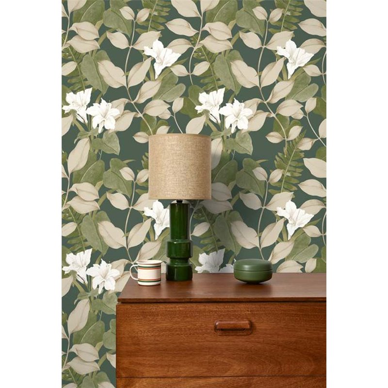 Papel pintado floral con lirios blanco y beige para dormitorio. Motivo floral suave para un ambiente cálido y tranquilo en tu dormitorio.
