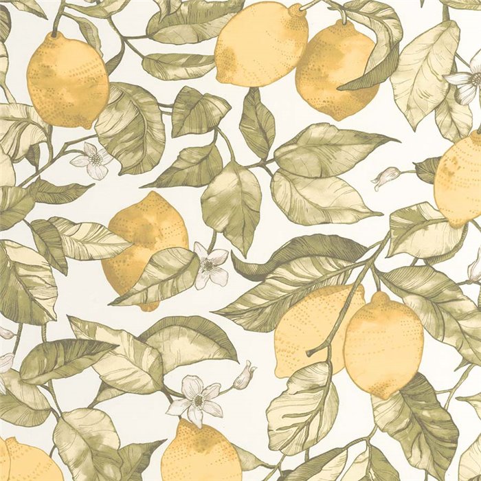 Papel pintado floral limonero con fondo naranja. Motivo cítrico cálido para un comedor lleno de energía y luminosidad.