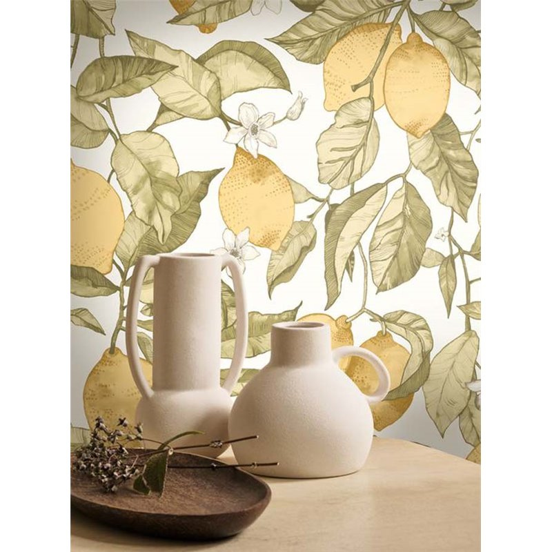 Papel pintado floral con limonero en flor verde. Flores verdes para un comedor con un ambiente fresco y natural.