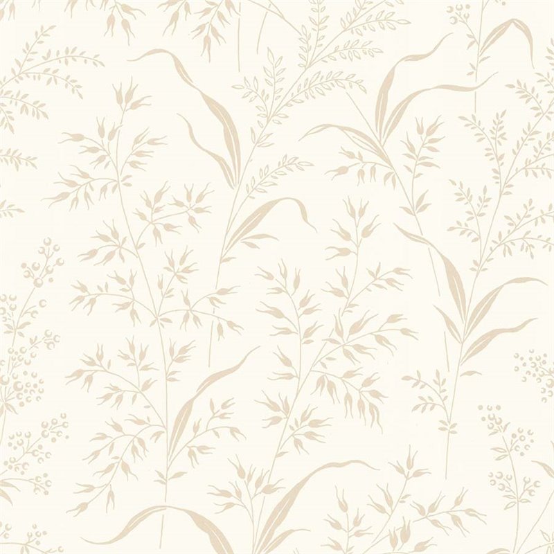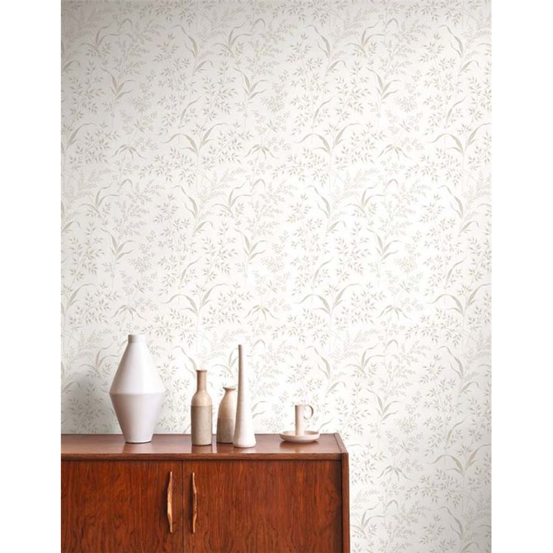 Papel pintado plantas silvestres blanco con como briza, espuela de caballero y timoteo. Motivo natural para un recibidor sereno.