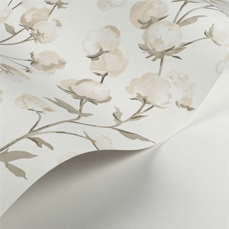 Papel pintado romántico flores de algodón blanco. Motivo floral suave para un dormitorio cálido y romántico.