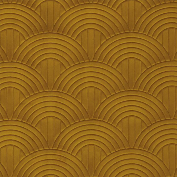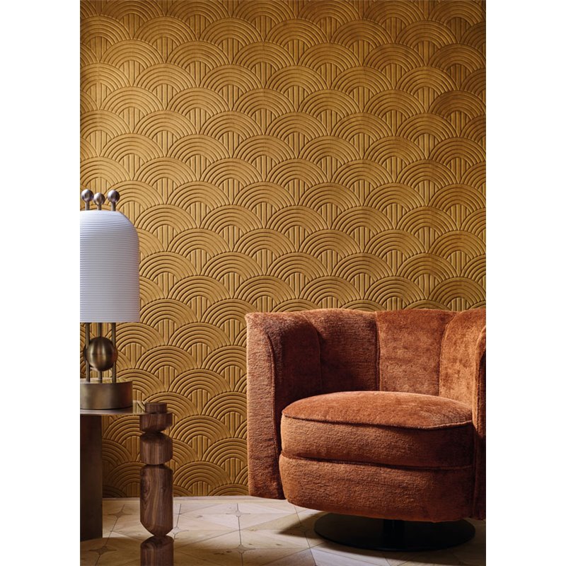 Revestimiento de pared aislante acústico de terciopelo, diseño 3D Art Deco beige empolvado, Casamance Arcane Volutis Beige Poudré. Precio por metro lineal, ancho de 130 cm.