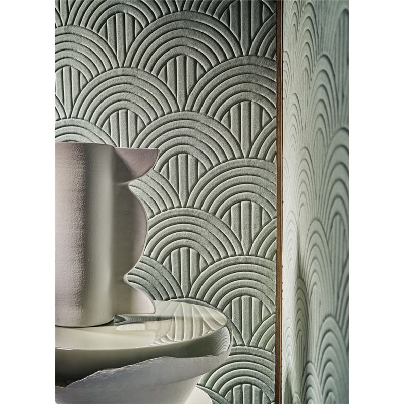 Revestimiento de pared aislante acústico, palmetas 3D estilo Art Deco greige, Casamance Arcane Volutis Grège. Precio por metro lineal, ancho de 130 cm.