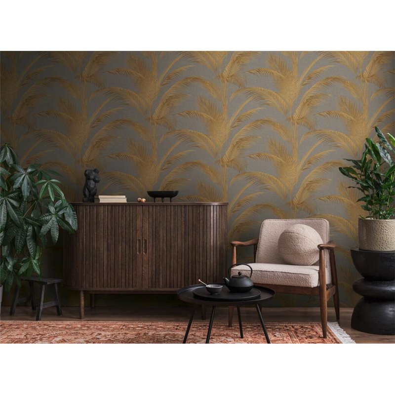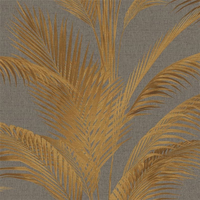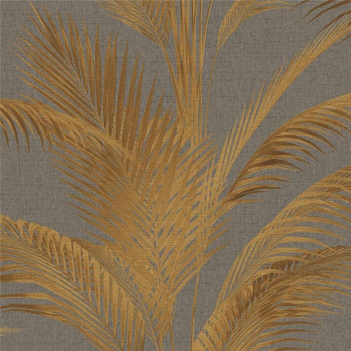 Papeldecor|Papel pintado hojas de palma metalizado dorado y gris|Floral