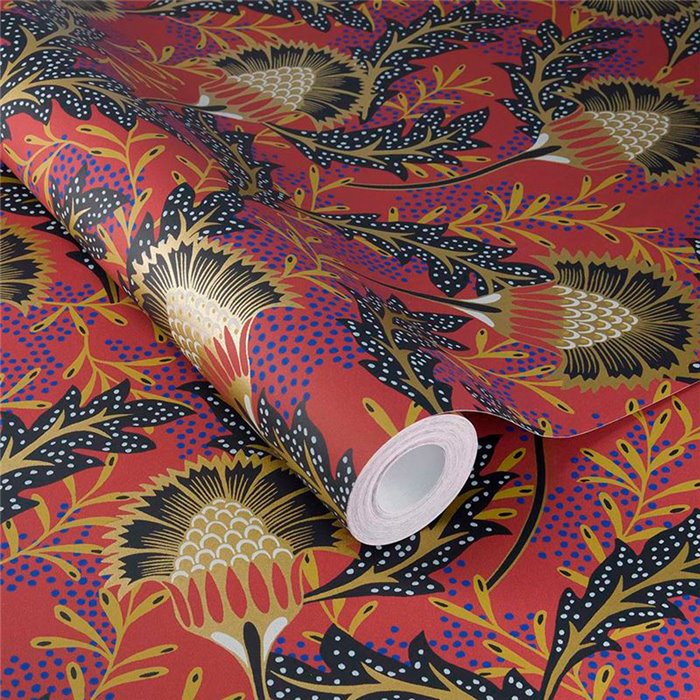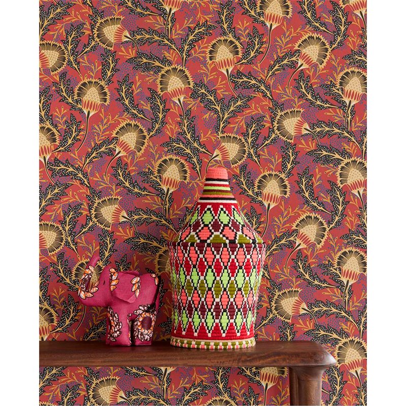 Papel pintado floral morado dorado étnico moderno de Eijffinger, colección Solange. Medidas: 52 cm x 10 m. Papel de pared tejido no tejido y lavable.