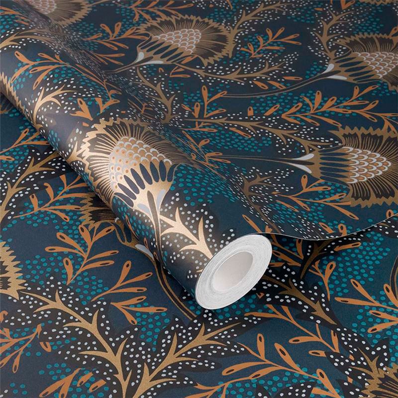 Papel pintado floral morado dorado étnico moderno de Eijffinger, colección Solange. Medidas: 52 cm x 10 m. Papel de pared tejido no tejido y lavable.