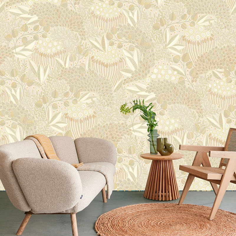 Mural de pared palmeras estilizadas en tonos beige/ocre de Eijffinfer, colección Solange. Medidas: 106 x 280 cm