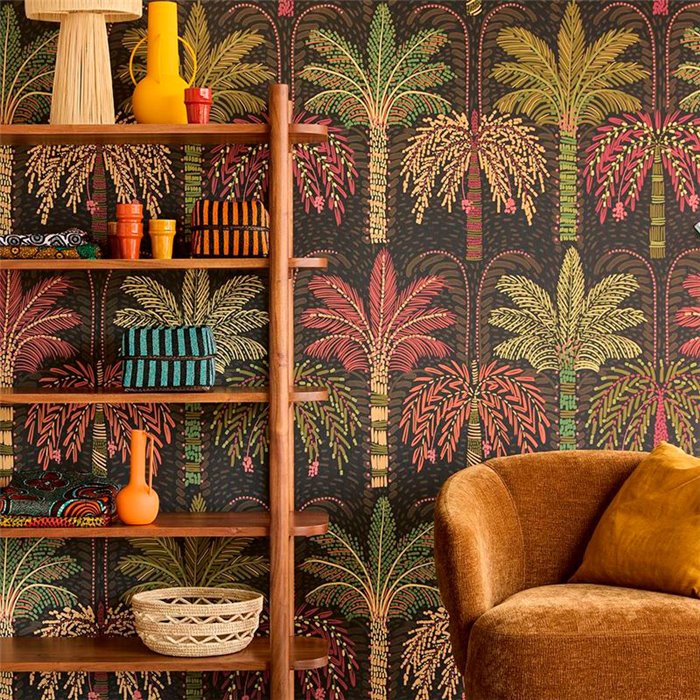 Mural de pared palmeras estilizadas en tonos beige/ocre de Eijffinfer, colección Solange. Medidas: 106 x 280 cm