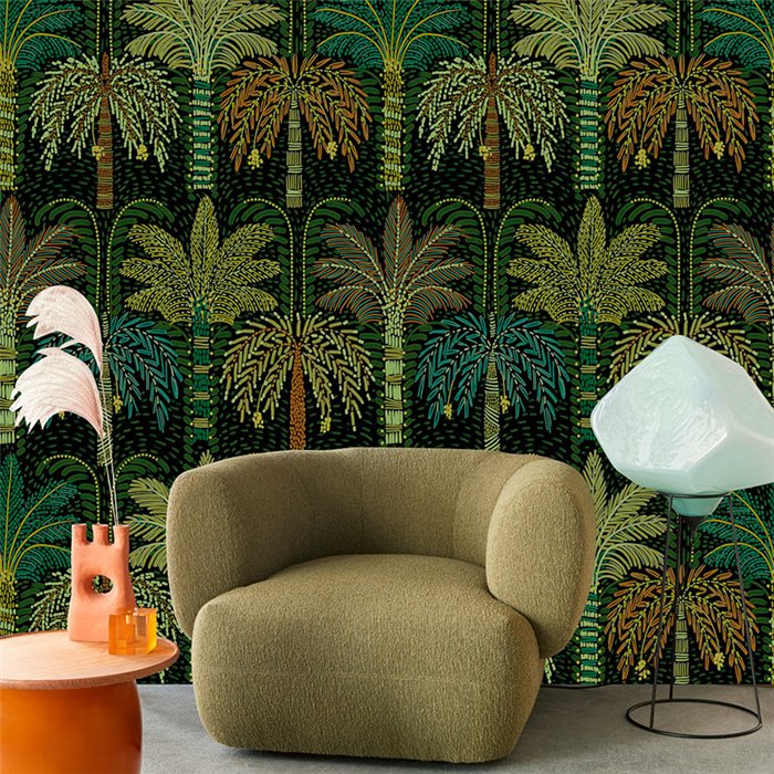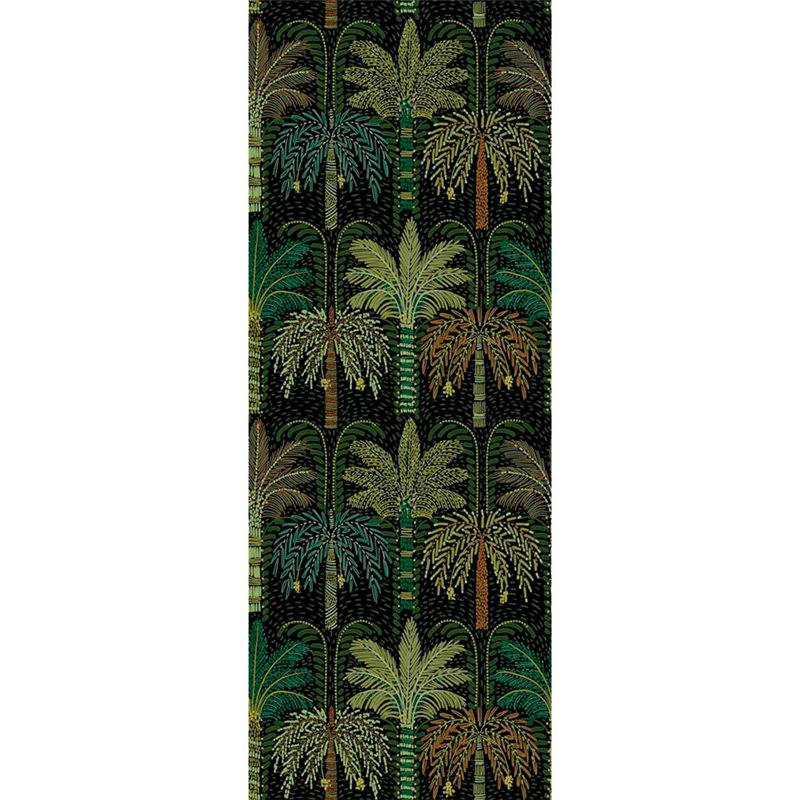 Mural de pared patrón repetitivo de palmeras estilizadas en varios tonos verdes de Eijffinfer, colección Solange. Medidas: 106 x 280 cm