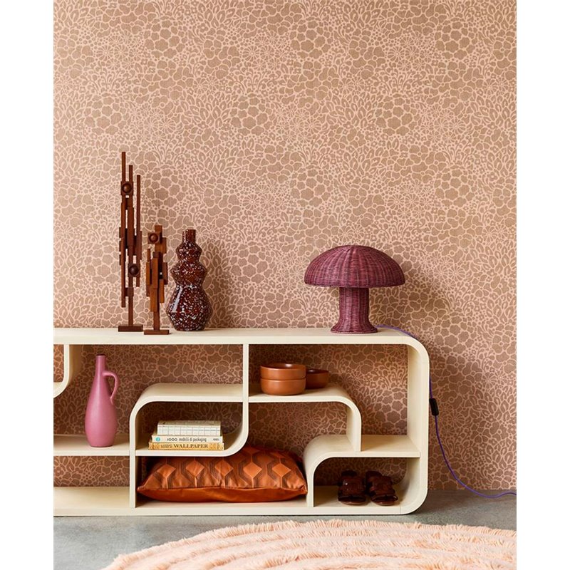 Papel pintado floral arpillería marrón rosa nude de Eijffinger, colección Groovy. Medidas: 52 cm x 10 m. Papel de pared tejido no tejido y lavable.