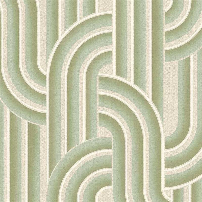 Papel pintado formas entrelazadas verde estilo moderno de Eijffinger, colección Groovy. Medidas: 52 cm x 10 m. Papel de pared tejido no tejido y lavable.