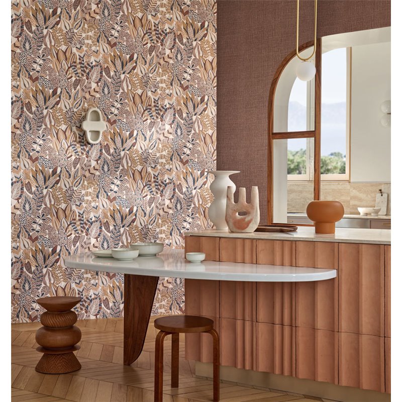 Papel pintado floral marrón y verde de Casamance, colección Palmadora. Calidad vinílico lavable, medidas: 70 cm x 10 m.