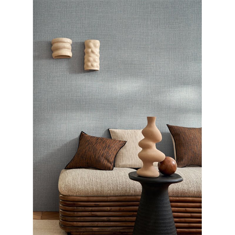 Papel pintado rafia tonos gris y azul de Casamance, colección Palmadora. Calidad vinílico lavable, medidas: 70 cm x 10 m.