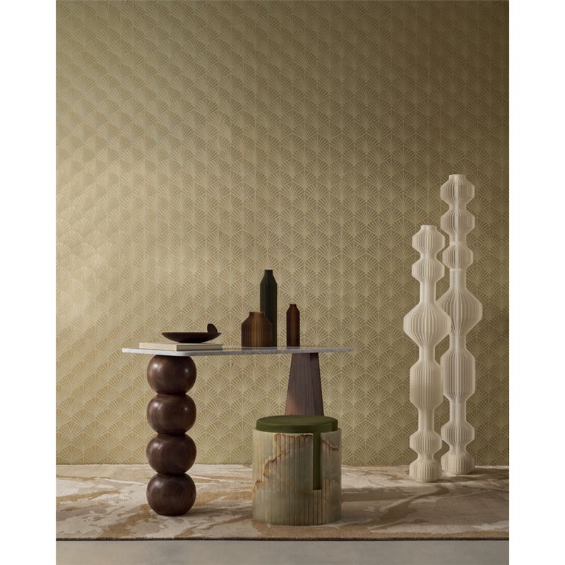 Les Néréides sont des constellations inspirées par des nymphes marines qui dansent à la lumière de la lune. Leur nom reflète la beauté des étoiles qui parsèment le ciel. Le papier peint Casamance Nereide Lichen/Doré a une texture métallisée, selon le modèle avec une encre argentée ou dorée sur une base lisse dans une gamme de couleurs tamisées. La texture luxueuse et riche du papier met en valeur le design en relief.