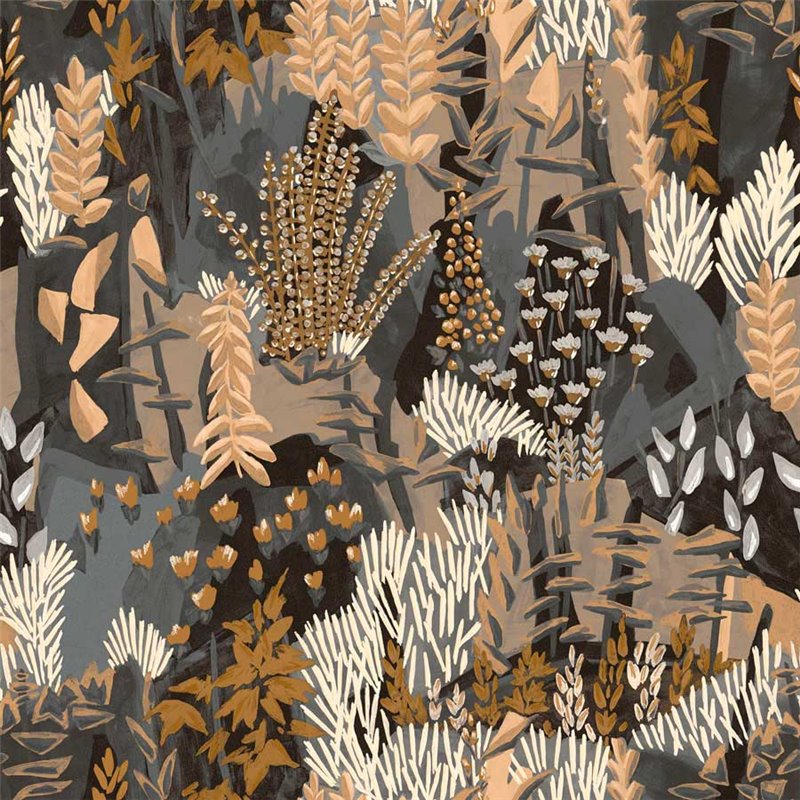 Papel pintado plantas de jardín con brezos verde y marrón de Casamance, colección Jardin Félicia. Calidad vinílico lavable, medidas: 70 cm x 10 m.