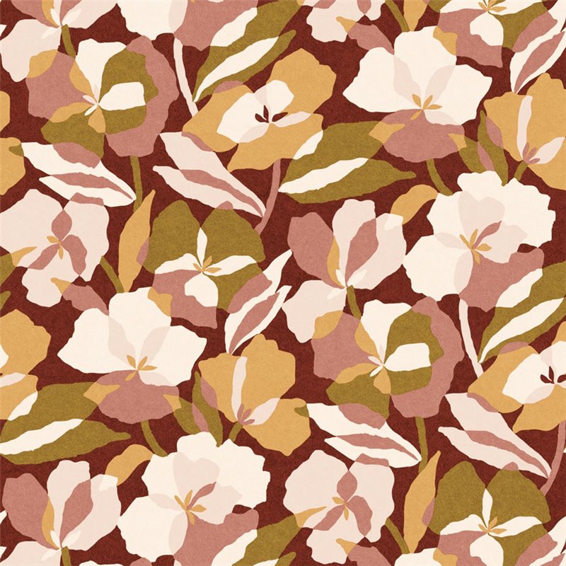 El papel pintado Casamance Amaryllis Grenat/Blush nos muestra una composición contemporánea, mezclando tonos profundos y flores superpuestas. Una película metálica dorada o cobriza añade un toque de sofisticación.