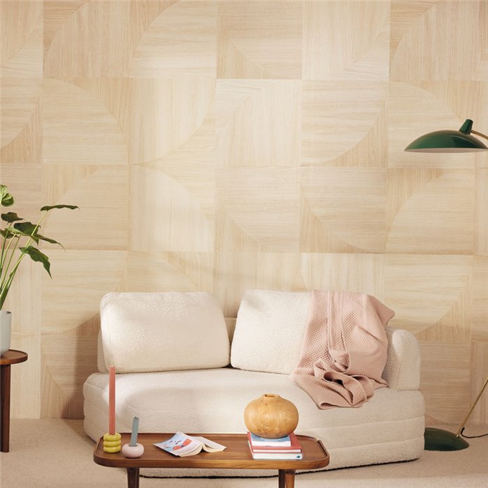 El mural de pared Caselio Bois D´Hiver tiene un patrón geométrico efecto madera inspirado en la marquetería, un perfecto trompe l'oeil para decorar interiores.