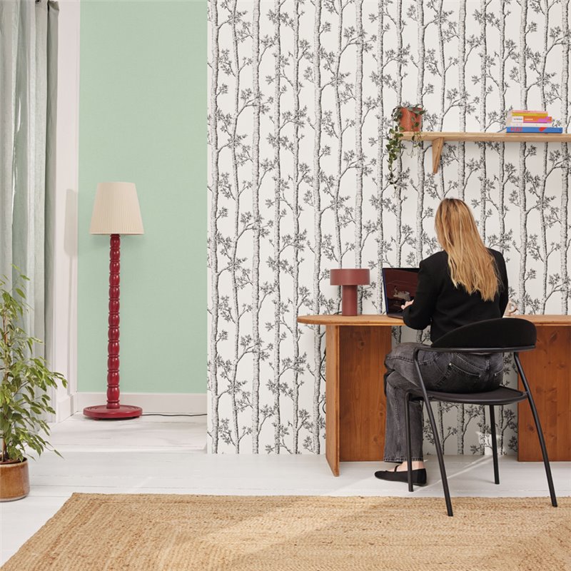 Papel pintado árboles otoñales verde agua. Caselio Balade, papel de pared calidad tejido no tejido lavable. Medidas: 53 cm x 10 metros