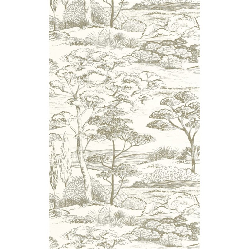 Papel pintado paisaje con pinos blanco y negro estilo mediterráneo. Pinos en contraste para un salón elegante.