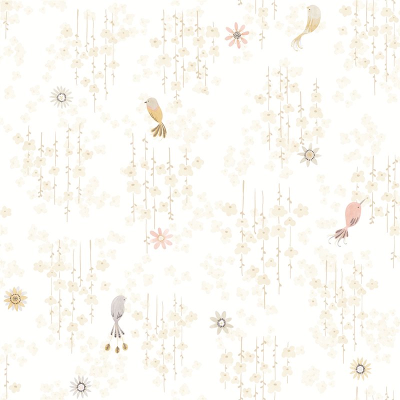 Papel pintado infantil pájaros exóticos y flores rosa pastel marca Casadeco, colección Once Upon A Time 2. Calidad tejido no-tejido lavable, medidas: 53 cm x 10 m.
