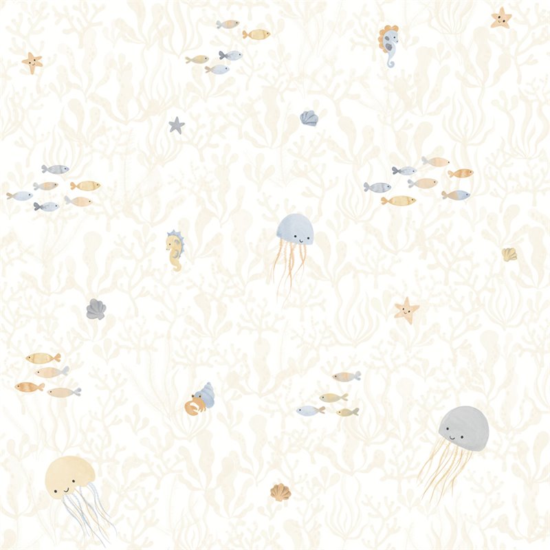 Papel pintado infantil animales marinos blanco y gris marca Casadeco, colección Once Upon A Time 2. Calidad tejido no-tejido lavable, medidas: 53 cm x 10 m.