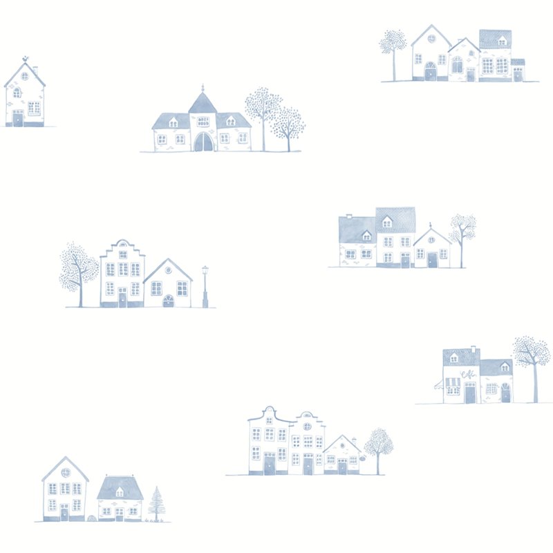Papel pintado infantil cabañas Toile de Jouy blanco y beige marca Casadeco, colección Once Upon A Time 2. Calidad tejido no-tejido lavable, medidas: 53 cm x 10 m.