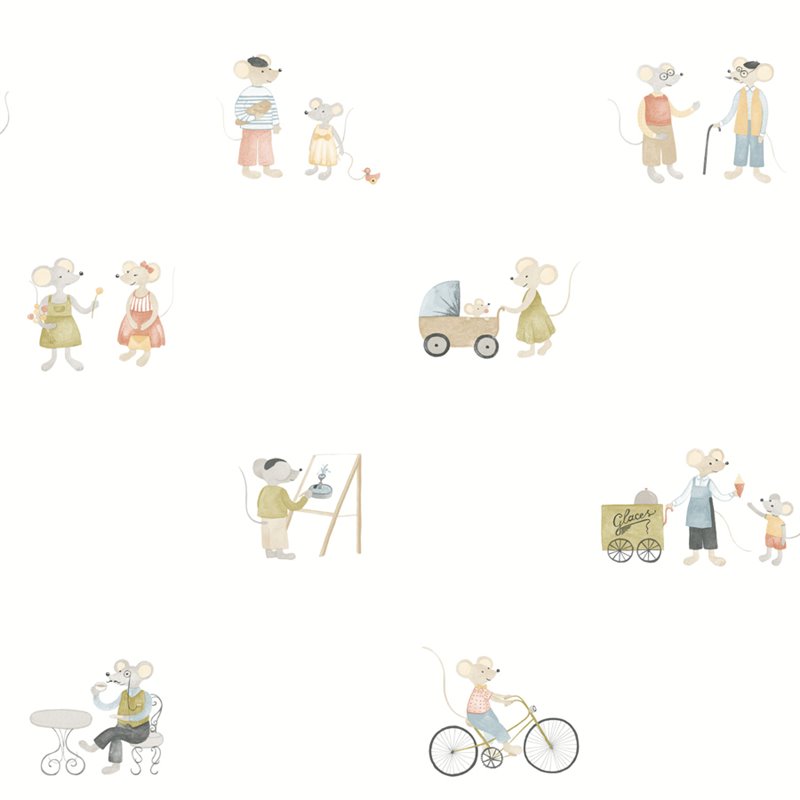 Papel pintado infantil aldea de ratones blanco y beige marca Casadeco, colección Once Upon A Time 2. Calidad tejido no-tejido lavable, medidas: 53 cm x 10 m.