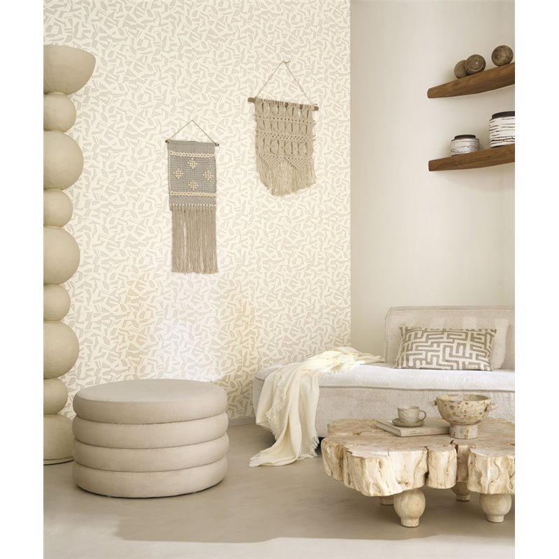 Papel pintado moderno efecto lino beige con un toque étnico. Cálido para un recibidor acogedor.