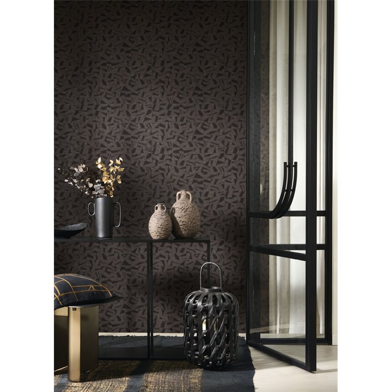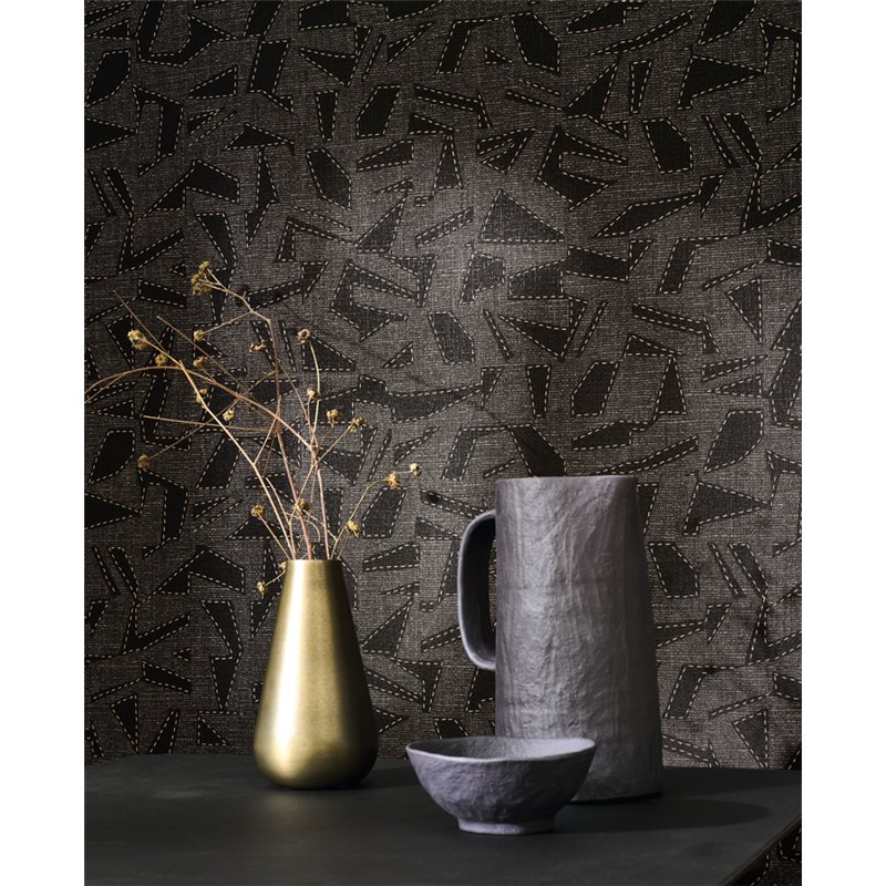 Papel pintado moderno efecto lino beige con un toque étnico. Cálido para un recibidor acogedor.