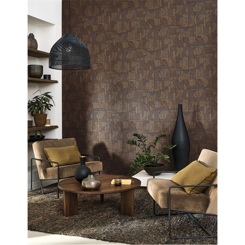 Papier peint patchwork ethnique contemporain marron. Raffiné pour une salle à manger moderne.