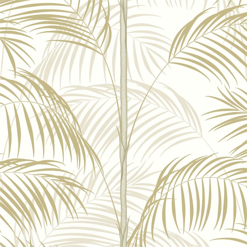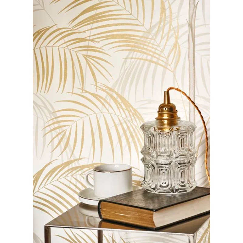 Papel pintado elegante con hojas de palmera blanco, dorado y plateado. Glamuroso para un salón chic.