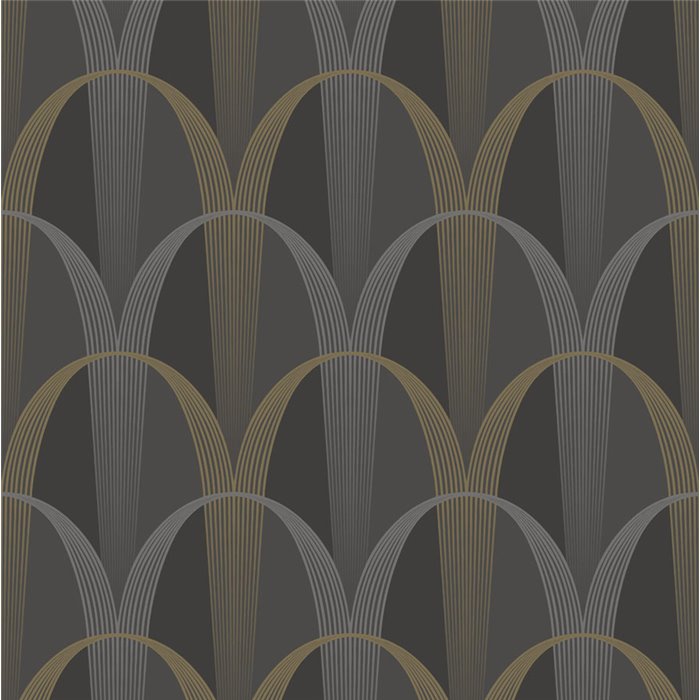 Papel pintado art deco con arcos iridiscentes tonos verdes y amarillos. Vibrante para un comedor moderno.