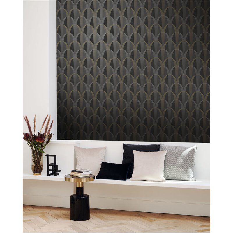 Papel pintado estilo art decó verde, ideal para espacios comerciales y hostelería. Elegante para boutiques.