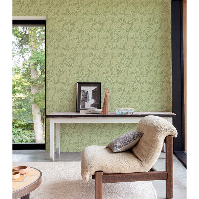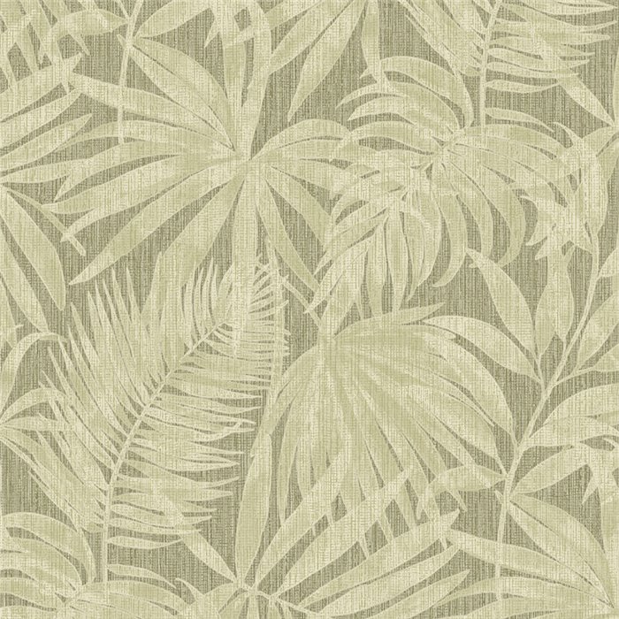 Papel pintado hojas de palmera color ocre tropical. Crea un ambiente acogedor para una pared destacada. Combina perfectamente con estilos modernos y clásicos.